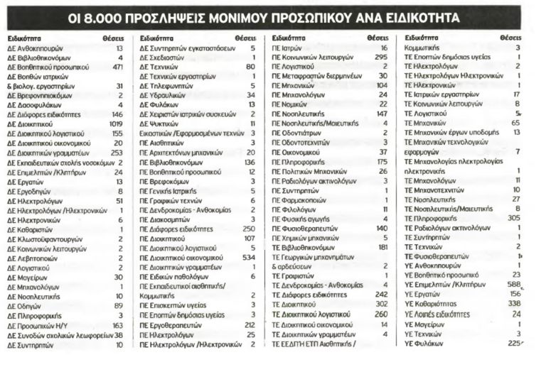 Σύμφωνα με το ρεπορτάζ του "ΕΘΝΟΥΣ", οι θέσεις αφορούν κυρίως διοικητικό και άλλο βοηθητικό και τεχνικό προσωπικό, το οποίο λείπει από δεκάδες φορείς του υπουργείου, εκ των οποίων 3.700 περίπου σε πανεπιστήμια και ΤΕΙ και 4.300 στους λοιπούς φορείς του υπουργείου.
