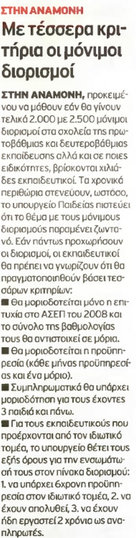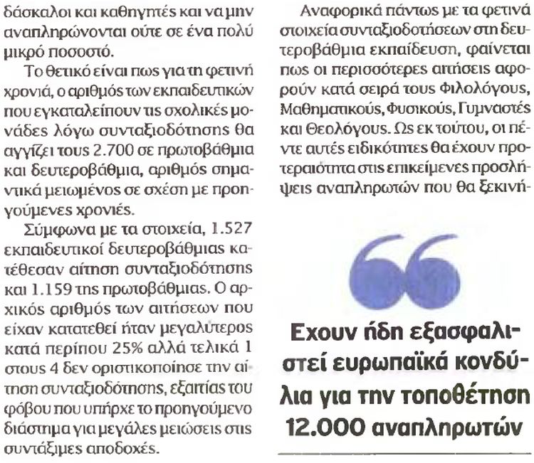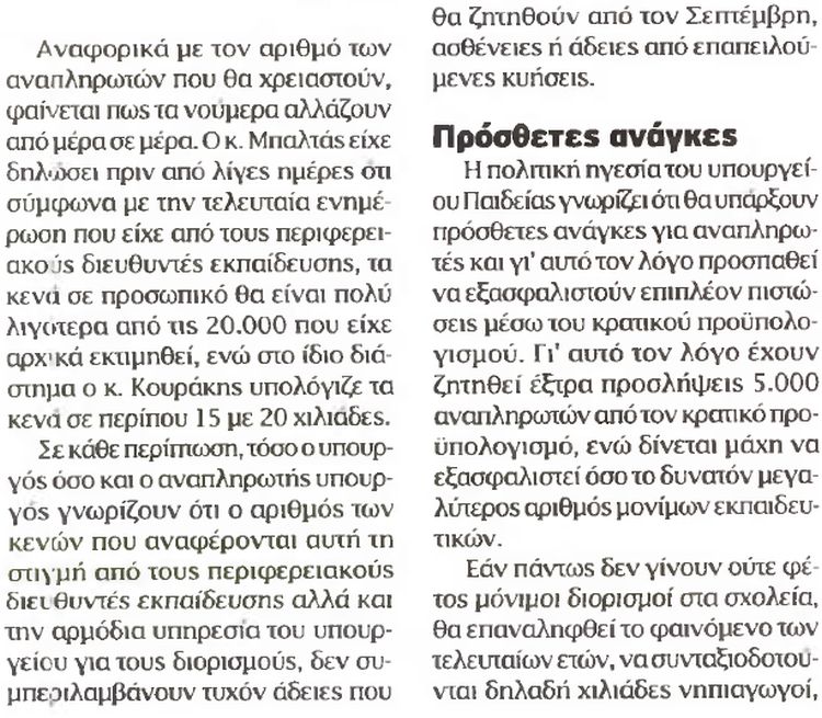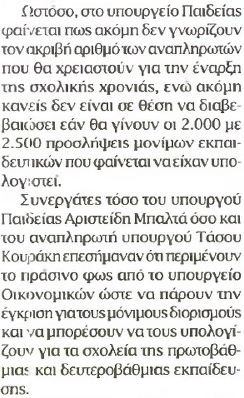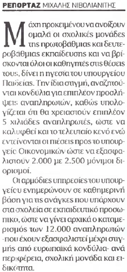 Το υπουργείο Παιδείας αναζητεί κονδύλια για επιπλέον 5.000 αναπληρωτές και πιέζει για την έγκριση 2.000 με 2.500 μόνιμων διορισμών.Στόχος η κάλυψη των κενών θέσεων δασκάλων και καθηγητών σε όλα τα σχολεία.