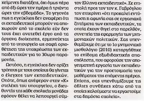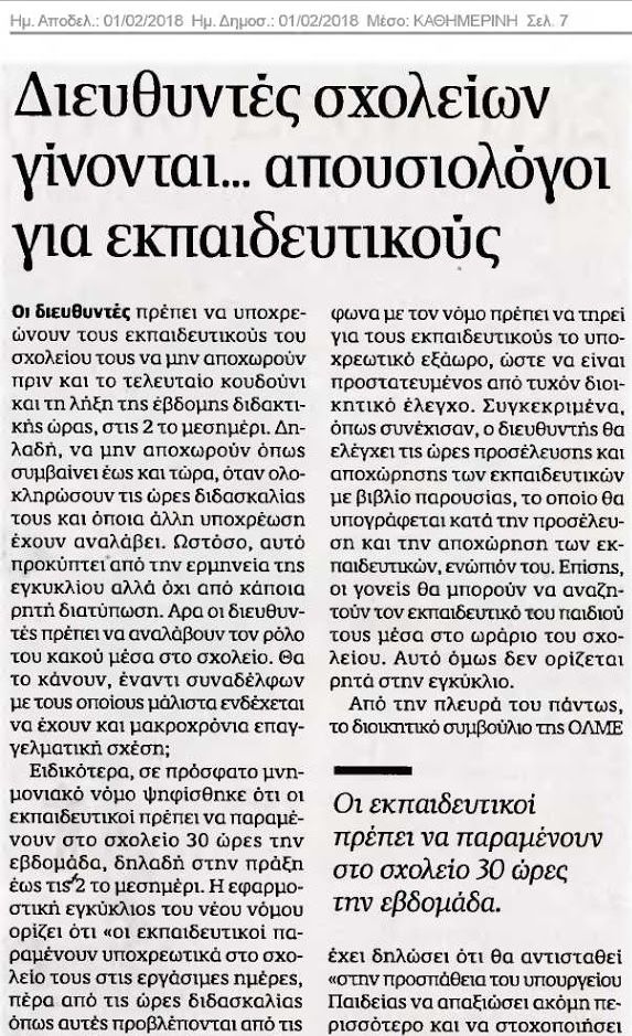 Συγκεκριμένα όπως συνέχισαν o διευθυντής θα ελέγχει τις ώρες προσέλευσης και αποχώρησης των εκπαιδευτικών με βιβλίο παρουσίας το οποίο θα υπογράφεται κατά την προσέλευση και την αποχώρηση των εκπαιδευτικών ενώπιόν του.