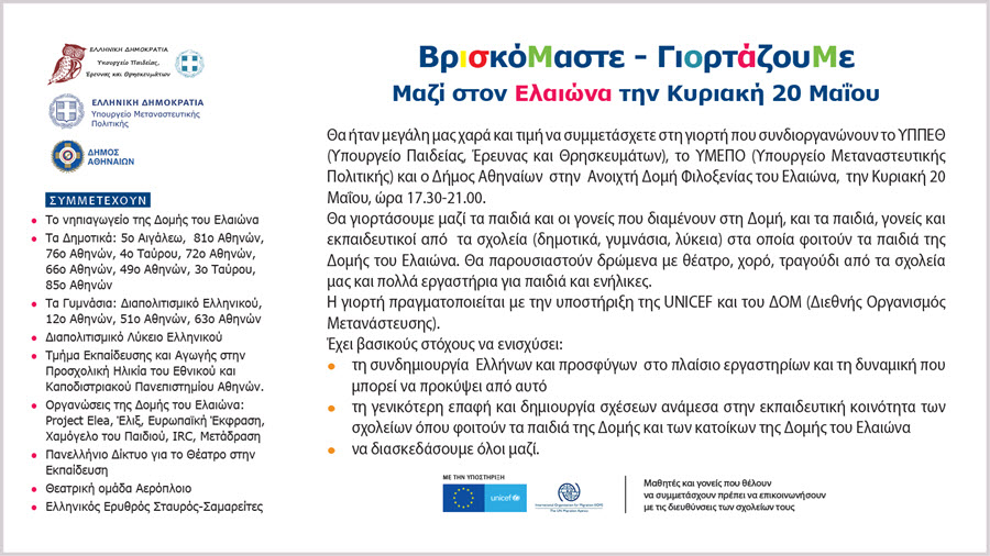 Με σύνθημα «Βρισκόμαστε - Γιορτάζουμε Μαζί στον Ελαιώνα», τα παιδιά, οι γονείς και οι εκπαιδευτικοί 15 σχολείων της Αθήνας και της Ανοιχτής Δομής Φιλοξενίας του Ελαιώνα, πραγματοποιούν την Κυριακή 20 Μαΐου, μια μεγάλη γιορτή.