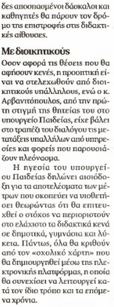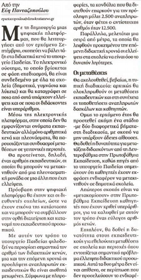 Το ηλεκτρονικό σύστημα θα είναι συνδεδεμένο με τα Δημοτικά, τα Γυμνάσια και τα Λύκεια και θα καταγράφει σε ποια οι διδάσκοντες είναι λιγότεροι και σε ποια περισσότεροι.