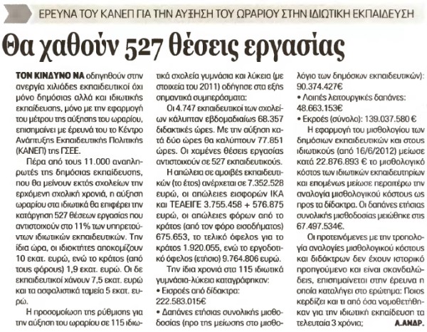 Τον κίνδυνο να οδηγηθούν στην ανεργία χιλιάδες εκπαιδευτικοί όχι μόνο δημόσιας αλλά και ιδιωτικής εκπαίδευσης, μόνο με την εφαρμογή του μέτρου της αύξησης του ωραρίου, επισημαίνει με έρευνά του το Κέντρο Ανάπτυξης Εκπαιδευτικής Πολιτικής (ΚΑΝΕΠ) της ΓΣΕΕ