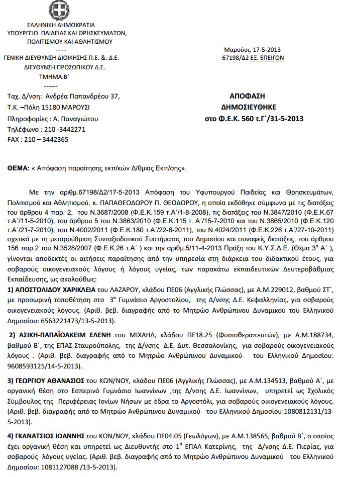 Υπ. Παιδείας: Απόφαση παραίτησης εκπαιδευτικών ΔΕ