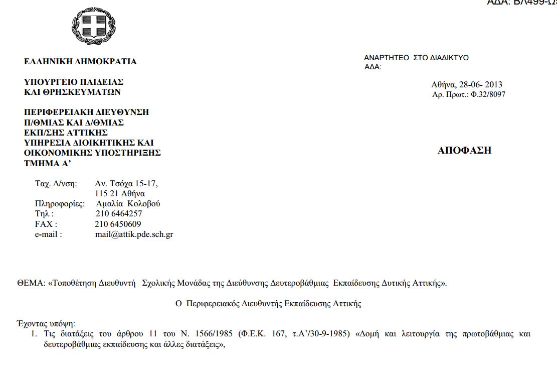 Τοποθέτηση διευθυντή σχολικής μονάδας της διεύθυνσης ΔΕ Δυτ. Αττικής