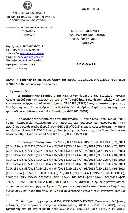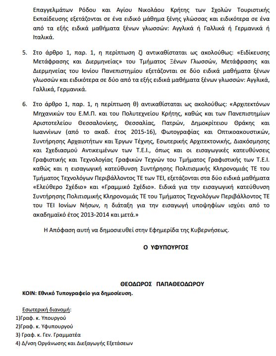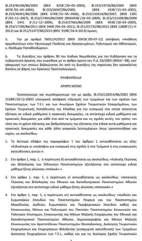 ΦΕΚ - Ορισμός των τμημάτων και των σχολών των Πανεπιστημίων, των ΤΕΙ και των Ανωτέρων Σχολών Τουριστικών Επαγγελμάτων, των Σχολών Τουριστικής Εκπαίδευσης της Ελλάδας καθώς και αυτών του πανεπιστημίου Κύπρου για την εισαγωγή στα οποία απαιτείται εξέταση σε ειδικά μαθήματα ή πρακτικές δοκιμασίες για κάθε ένα από τα τμήματα και τις σχολές αυτές, τον τρόπο, τον τόπο και το χρόνο εξέτασης και βαθμολόγησης της εξέτασης στα ειδικά αυτά μαθήματα και πρακτικές δοκιμασίες και κάθε άλλη αναγκαία λεπτομέρεια.