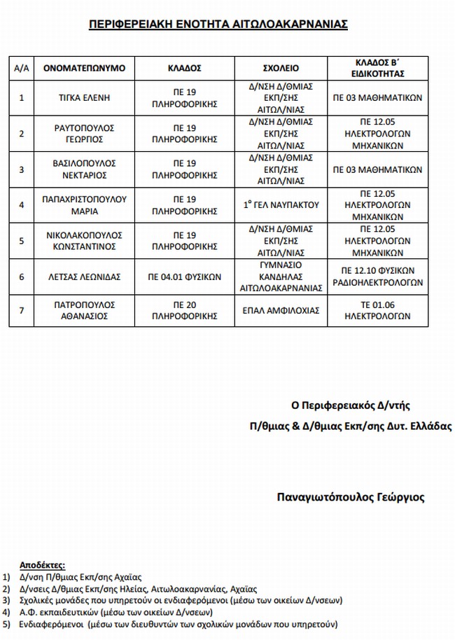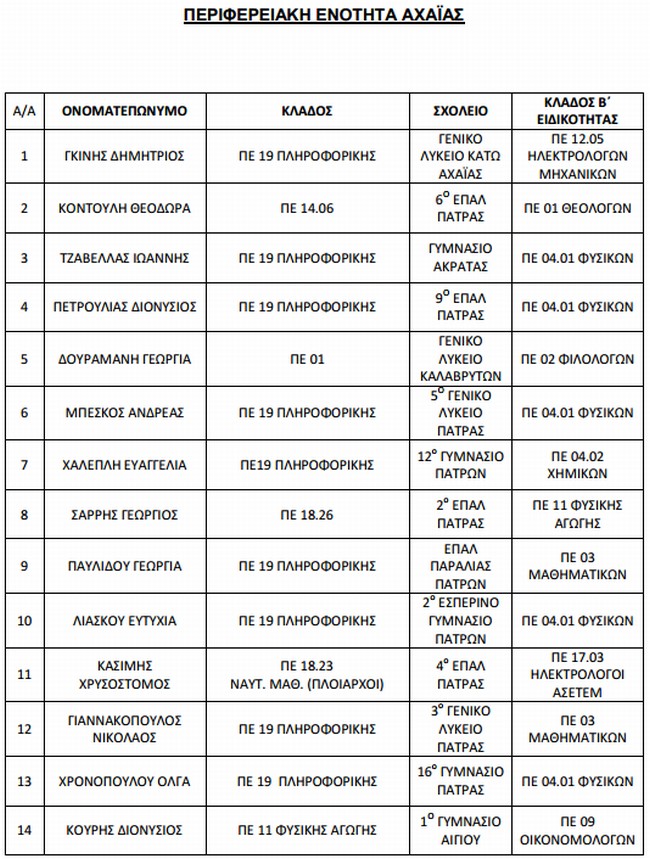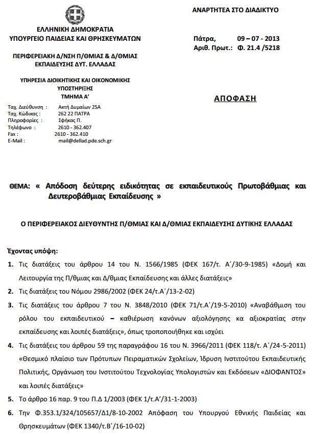 Απόδοση δεύτερης ειδικότητας σε εκπαιδευτικούς Πρωτοβάθμιας και Δευτεροβάθμιας Εκπαίδευσης - Ολα τα ονόματα