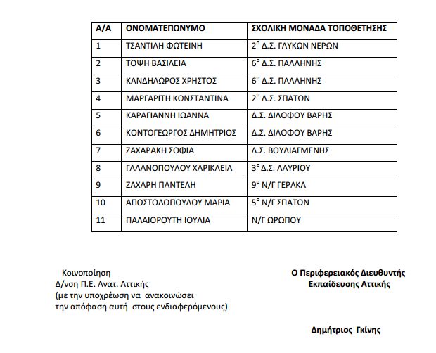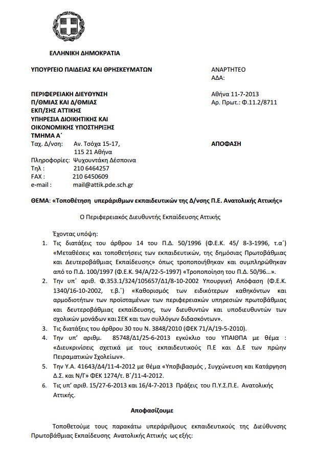 Υπ. Παιδείας: Τοποθέτηση υπεράριθμων εκπαιδευτικών της δ/νσης ΠΕ Ανατ. Αττικής
