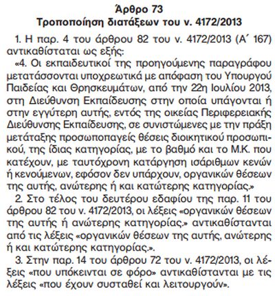 4.Οι εκπαιδευτικοί της προηγούμενης παραγράφου μετατάσσονται υποχρεωτικά με απόφαση του υπουργού Παιδείας και Θρησκευμάτων, από την 22η Ιουλίου 2013, στη Διεύθυνση Εκπαίδευσης στην οποία υπάγονται ή στην εγγύτερη αυτής, εντός της οικείας Περιφερειακής Διεύθυνσης Εκπαίδευσης, σε συνιστώμενες με την πράξη μετάταξης προσωποπαγείς θέσεις διοικητικού προσωπικού, της ίδιας κατηγορίας, με βαθμό και το ΜΚ που κατέχουν, με ταυτόχρονη κατάργηση ισάριθμων κενών ή κενούμενων, εφόσον δεν υπάρχουν, οργανικών θέσεων της αυτής, ανώτερης ή και κατώτερης κατηγορίας"