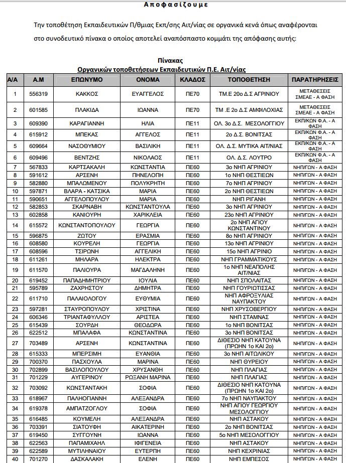 Τοποθέτηση εκπαιδευτικών ΠΕ Αιτωλοακαρνανίας σε οργανικά κενά