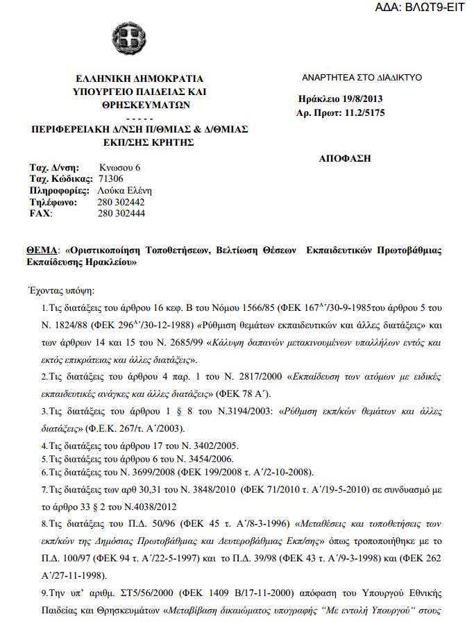 Οριστικοποίηση τοποθετήσεων, βελτίωση θέσεων εκπαιδευτικών ΠE Ηρακλείου