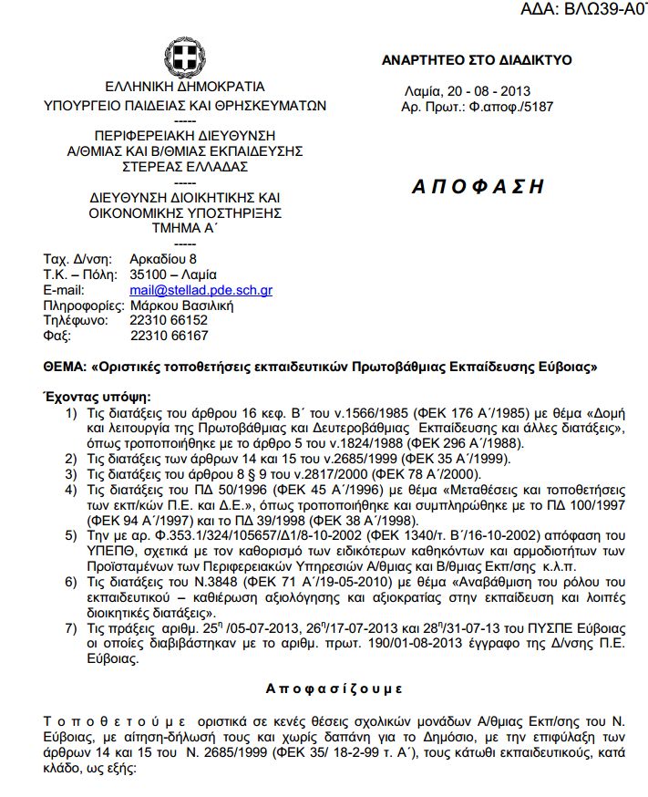 Οριστικές τοποθετήσεις εκπαιδευτικών ΠΕ Εύβοιας