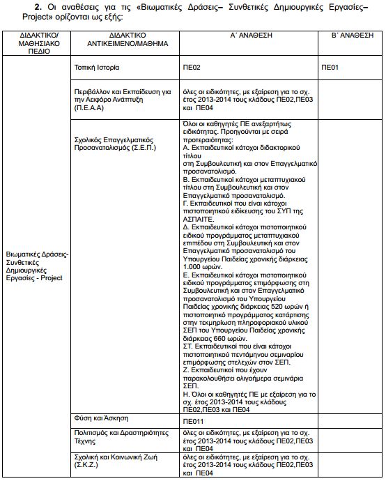 1. Το μάθημα «Ερευνητική εργασία (Project)» στην Α΄ και Β΄ τάξη του Γενικού Λυκείου και στην Α΄ και Β΄ τάξη του Εσπερινού Γενικού Λυκείου, ορίζεται ως πρώτη ανάθεση σε όλους τους εκπαιδευτικούς ΠΕ ανεξαρτήτως κλάδου-ειδικότητας που διδάσκουν στο Γενικό Λύκειο.