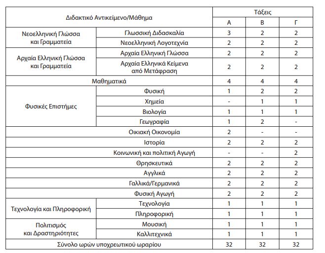 Το ωρολόγιο πρόγραμμα μαθημάτων των Εσπερινών Γυμνασίων. Βλέπε το ΦΕΚ εδώ