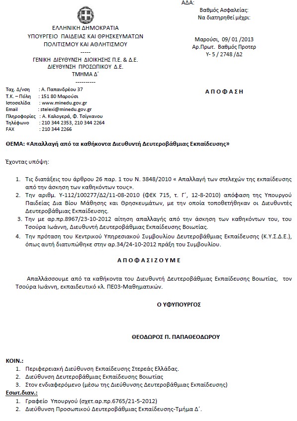 Απαλλαγή από τα καθήκοντα Διευθυντή Δευτεροβάθμιας Εκπαίδευσης