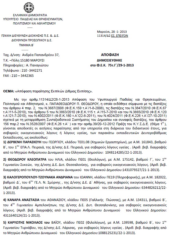 Απόφαση παραίτησης εκπαιδευτικών Δευτεροβάθμιας Εκπαίδευσης.