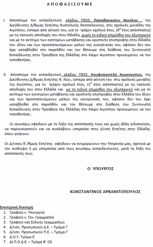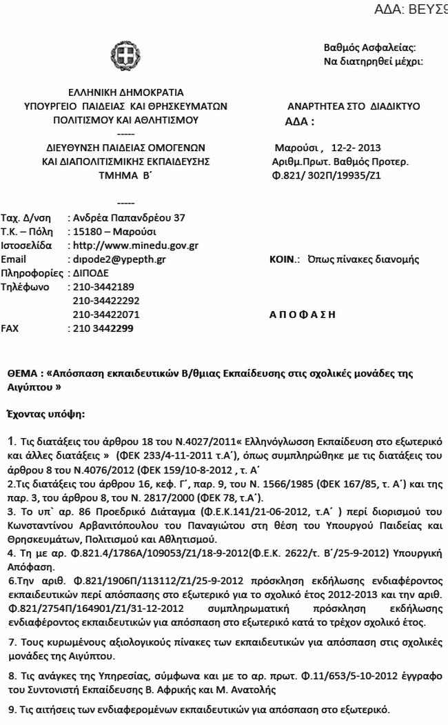 Υπ. Παιδείας: Απόσπαση εκπαιδευτικών ΔΕ στις σχολικές μονάδες της Αιγύπτου