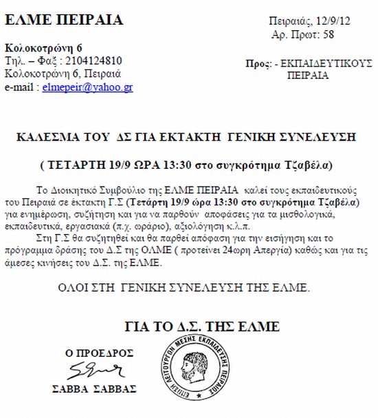 13.09.2012 - 21:55 ΕΛΜΕ Πειραιά: Εκτακτη Γενική Συνέλευση στις 19/9 ΑΝΑΚΟΙΝΩΣΕΙΣ ΕΛΜΕ Πειραιά: Εκτακτη Γενική Συνέλευση στις 19/9