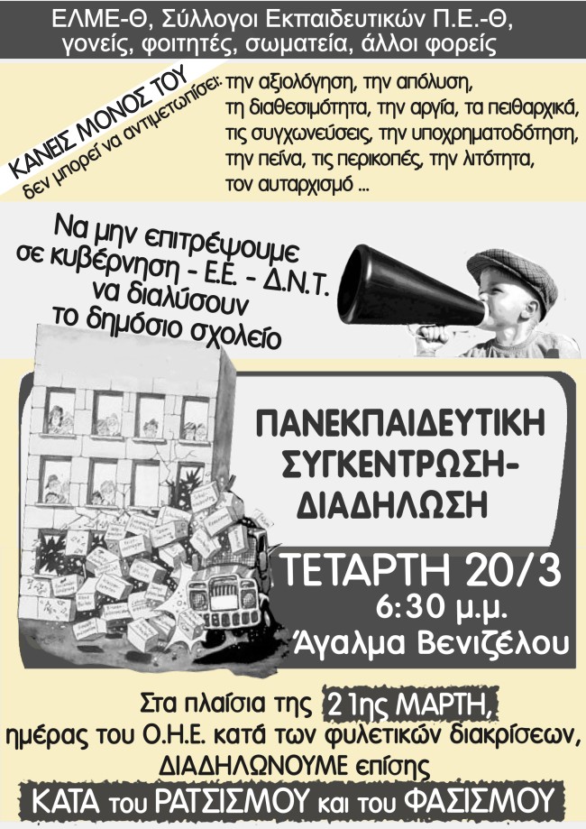 15.03.2013 - 09:31 Θεσσαλονίκη: Πανεκπαιδευτικό συλλαλητήριο στις 20 Μάρτη Θεσσαλονίκη: Πανεκπαιδευτικό συλλαλητήριο στις 20 Μάρτη ΑΝΑΚΟΙΝΩΣΕΙΣ Θεσσαλονίκη: Πανεκπαιδευτικό συλλαλητήριο στις 20 Μάρτη
