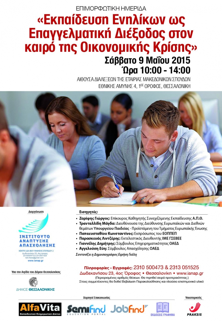 Στα πλαίσια των διδακτικών και ερευνητικών ενδιαφερόντων, αλλά και της Δια βίου Μάθησης την οποία πρεσβεύει και υπηρετεί το Ινστιτούτο Ανάπτυξης Απασχόλησης, διοργανώνεται Ημερίδα με θέμα την «Εκπαίδευση Ενηλίκων ως Επαγγελματική διέξοδος στον καιρό της οικονομικής κρίσης»