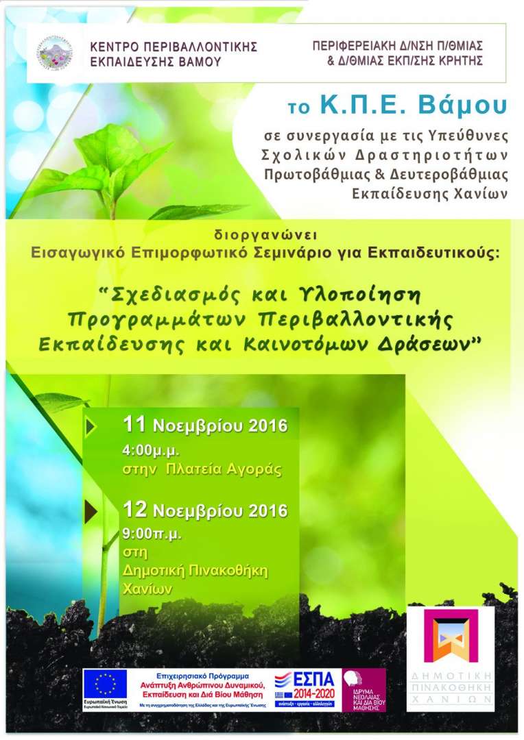 Το Κέντρο Περιβαλλοντικής Εκπαίδευσης (ΚΠΕ) Βάμου, στο πλαίσιο του Πράξης «ΚΕΝΤΡΑ ΠΕΡΙΒΑΛΛΟΝΤΙΚΗΣ ΕΚΠΑΙΔΕΥΣΗΣ (ΚΠΕ)-ΠΕΡΙΒΑΛΛΟΝΤΙΚΗ ΕΚΠΑΙΔΕΥΣΗ», το οποίο υλοποιείται μέσω του Επιχειρησιακού Προγράμματος «ΑΝΑΠΤΥΞΗ ΑΝΘΡΩΠΙΝΟΥ ΔΥΝΑΜΙΚΟΥ, ΕΚΠΑΙΔΕΥΣΗ ΚΑΙ ΔΙΑ ΒΙΟΥ ΜΑΘΗΣΗ» με τη συγχρηματοδότηση της Ελλάδας και της Ευρωπαϊκής Ένωσης, οργανώνει σε συνεργασία με τις Υπεύθυνες Σχολικών Δραστηριοτήτων Πρωτοβάθμιας και Δευτεροβάθμιας Εκπαίδευσης Χανίων και τη Δημοτική Πινακοθήκη Χανίων, Σεμινάριο Περιβαλλοντικής Εκπαίδευσης 8 ωρών, με θέμα: