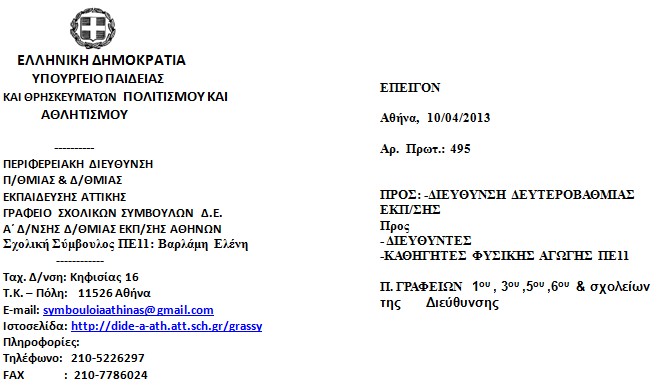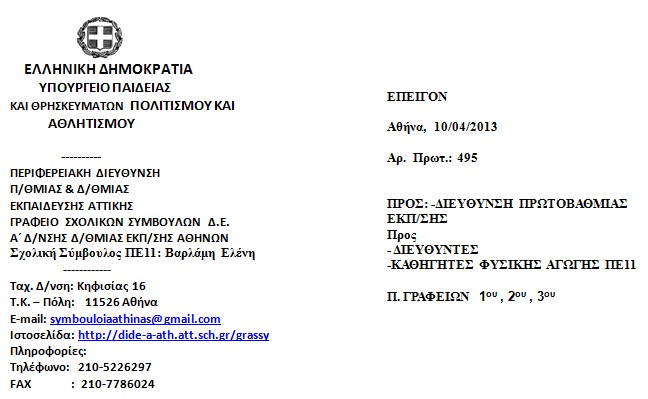 Παρακαλώ, όπως ενημερωθούν ενυπόγραφα οι καθηγητές Φυσικής Αγωγής ΠΕ11 καθώς η συμμετοχή τους είναι υποχρεωτική και θα δοθεί βεβαίωση παρακολούθησης.