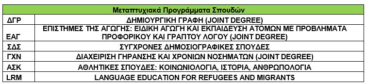 Για να πληροφορηθείτε σχετικά με τις προϋποθέσεις εισαγωγής των Προγραμμάτων: ΔΓΡ Δημιουργική Γραφή, ΕΑΓ Επιστήμες της Αγωγής: Ειδική Αγωγή και Εκπαίδευση Ατόμων με Προβλήματα Προφορικού και Γραπτού Λόγου, ΣΔΣ Σύγχρονες Δημοσιογραφικές Σπουδές, ΓΧΝ Διαχείριση Γήρανσης και Χρόνιων Νοσημάτων, ΑΣΚ Αθλητικές Σπουδές: Κοινωνιολογία, Ιστορία, Ανθρωπολογία, LRM Language education for refugees and migrants, πατήστε εδώ.