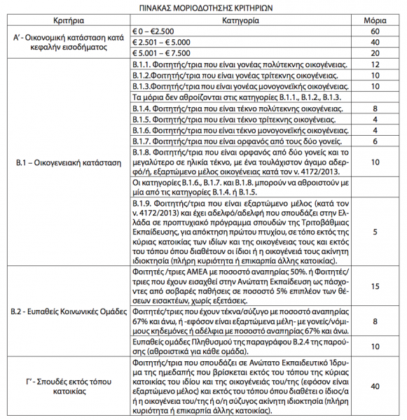 Μοριοδοτούνται φοιτητές που ανήκουν σε ευπαθείς κοινωνικές ομάδες και των οποίων η συμμετοχή στη φοι- τητική ζωή δυσχεραίνεται, είτε εξαιτίας κοινωνικών και οικονομικών προβλημάτων, είτε εξαιτίας σωματικών ή ψυχικών διαταραχών, ως ακολούθως: