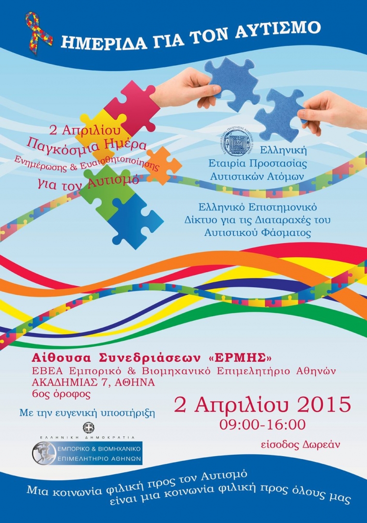 Η Ελληνική Εταιρία Προστασίας Αυτιστικών Ατόμων (ΕΕΠΑΑ) διοργανώνει, με τη συμμετοχή εκλεκτών επιστημόνων του Ελληνικού Επιστημονικού Δικτύου Επιστημόνων για τις Διαταραχές του Αυτιστικού Φάσματος, Ημερίδα για τον Αυτισμό στο πλαίσιο της Παγκόσμιας Ημέρας Ενημέρωσης και Ευαισθητοποίησης για τον Αυτισμό: 2 Απριλίου.