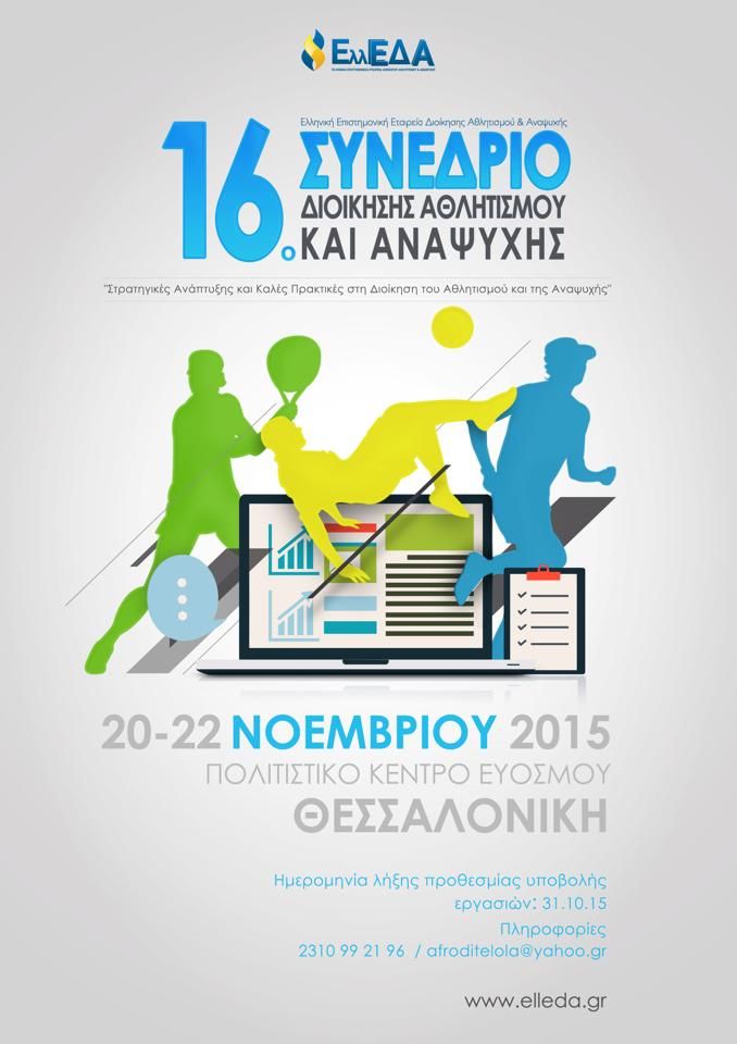 Με ιδιαίτερη χαρά η Ελληνική Επιστημονική Εταιρεία Διοίκησης Αθλητισμού & Αναψυχής (www.elleda.gr) ενημερώνει ότι το 16ο ετήσιο συνέδριό της με διεθνή συμμετοχή θα διοργανωθεί σε συνεργασία με τη Διεύθυνση Παιδείας & Κοινωνικής Προστασίας του Δήμου Κορδελιού Ευόσμου, στο Πολιτιστικό Κέντρο Ευόσμου (Μ. Αλεξάνδρου 57, Θεσσαλονίκη), την ΠΑΡΑΣΚΕΥΗ 20, ΣΑΒΒΑΤΟ 21, και την ΚΥΡΙΑΚΗ 22 NOEΜΒΡΙΟΥ 2015, υπό τον τίτλο: "Στρατηγικές Ανάπτυξης και Καλές Πρακτικές στη Διοίκηση του Αθλητισμού και της Αναψυχής".