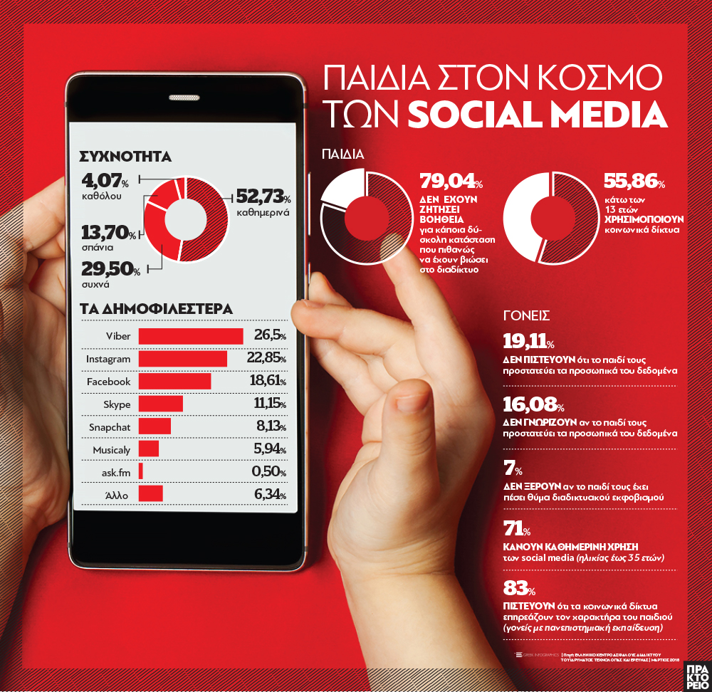 Γενικά, πολύ σπάνια (ποσοστό μόλις 20%) τα παιδιά ζητούν τη βοήθεια των γονιών τους για κάποιο πρόβλημα που αντιμετωπίζουν στα social media, ενώ πολύ υψηλό (35%) είναι το ποσοστό εκείνων που δεν γνωρίζουν ή απαντούν αρνητικά στο ερώτημα αν τα παιδιά τους προστατεύουν τα προσωπικά τους δεδομένα στο διαδίκτυο.
