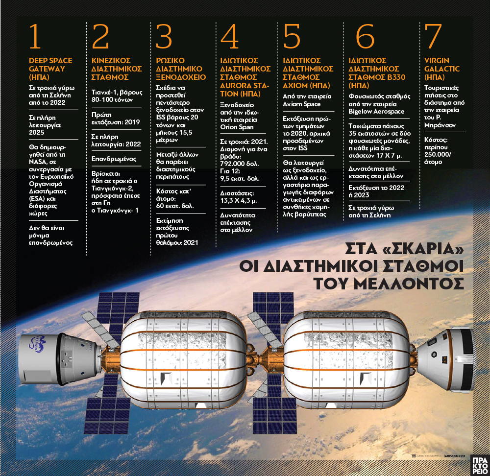 Το γράφημα αποτυπώνει στοιχεία σχετικά με την ανάπτυξη διαστημικών σταθμών σε τροχιά γύρω από τη Γη και τη Σελήνη / ΑΠΕ-ΜΠΕ / Δημοσιογραφική επιμέλεια: Βασ. Κοριμέντζας / Ρεπορτάζ: Παύλος Δρακόπουλος
