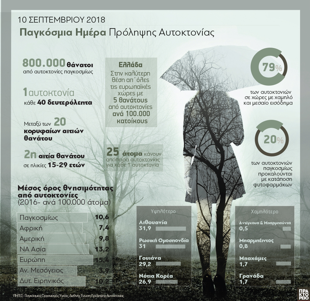 Με μία αυτοκτονία κάθε 40 δευτερόλεπτα, το στοίχημα της πρόληψης παραμένει παγκόσμια πρόκληση. Σε όλο τον κόσμο περισσότεροι από 800.000 θάνατοι οφείλονται σε αυτοκτονίες, γεγονός που τις τοποθετεί μεταξύ των 20 κορυφαίων αιτιών θανάτου, για ανθρώπους όλων των ηλικιών. Μάλιστα για τους νέους ηλικίας 15-29 ετών, η αυτοκτονία ήταν δεύτερη αιτία θανάτου το 2016.