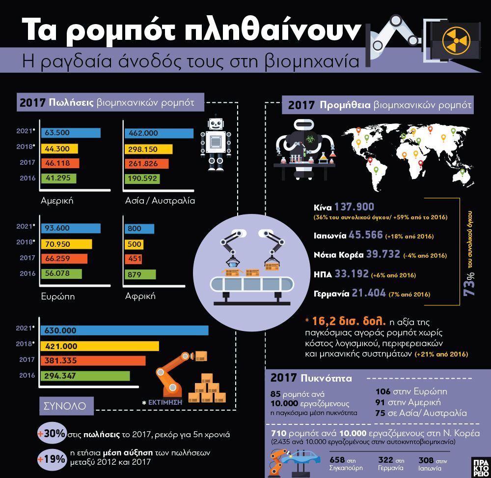 Οι πωλήσεις ρομπότ εκτιμάται ότι θα αυξηθούν κατά 10% το 2018, ενώ τα ποσοστά αύξησης θα επιταχυνθούν σε 14% κατά μέσο όρο ετησίως μεταξύ 2019 και 2021: Στην Ευρώπη κατά 10%, στην Αμερική κατά 13% και στην Ασία κατά 16%. Μεταξύ 2018 και 2021, εκτιμάται ότι σχεδόν 2,1 εκατ. νέα βιομηχανικά ρομπότ θα εγκατασταθούν σε εργοστάσια σε όλο τον κόσμο.