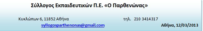 12.03.2013 - 12:09 Σύλλογος ΠΕ "Ο Παρθενώνας": Δεν συμπληρώνουμε τα ερωτηματολόγια των ιδιωτικών εταιρειών και του ΕΣΠΑ ΑΝΑΚΟΙΝΩΣΕΙΣ Σύλλογος ΠΕ "Ο Παρθενώνας": Δεν συμπληρώνουμε τα ερωτηματολόγια των ιδιωτικών εταιρειών και του ΕΣΠΑ
