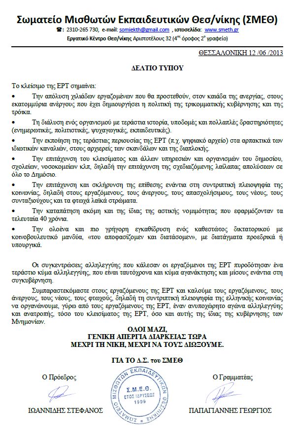 Σωματείο μισθωτών εκπαιδευτικών Θεσσαλονίκης: Αλληλεγγύη στους απολυμένους της ΕΡΤ