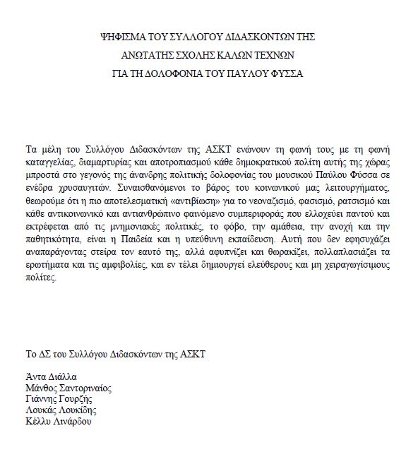 Ψήφισμα του Συλλόγου Διδασκόντων της Α.Σ.Κ.Τ. για την πολιτική δολοφονία του Παύλου Φύσσα