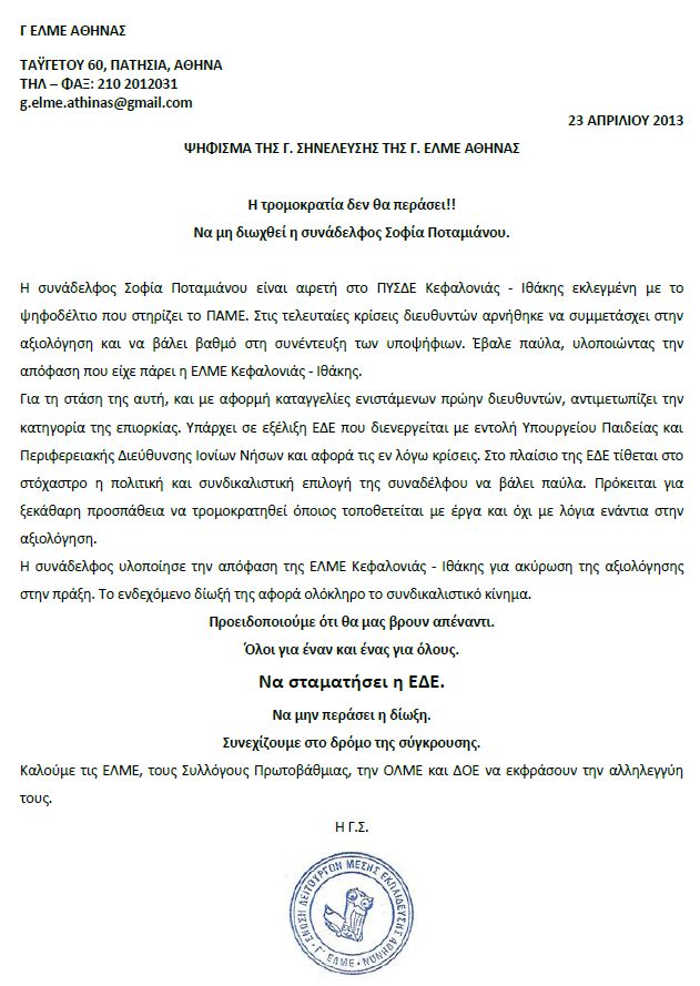 Γ ΕΛΜΕ Αθήνας: Να μη διωχθεί η συνάδελφος Σοφία Ποταμιάνου