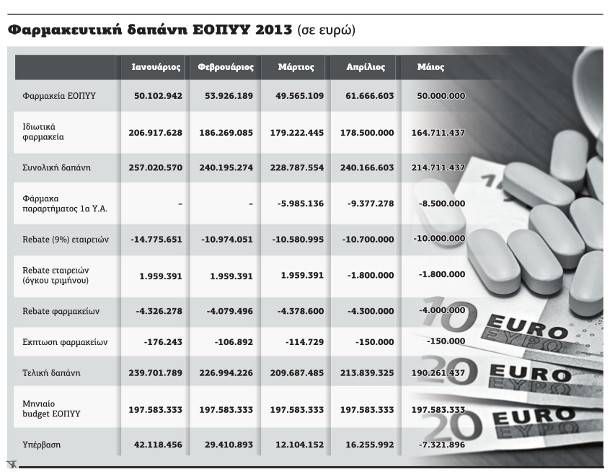 Η υπέρβαση της φαρμακευτικής δαπάνης κατά 92 εκατ. ευρώ το πρώτο πεντάμηνο του 2013 προκαλεί φόβους ότι το υπουργείο Υγείας θα καταφύγει στη γνωστή μέθοδο της αύξησης της συμμετοχής ασφαλισμένων ασθενών.