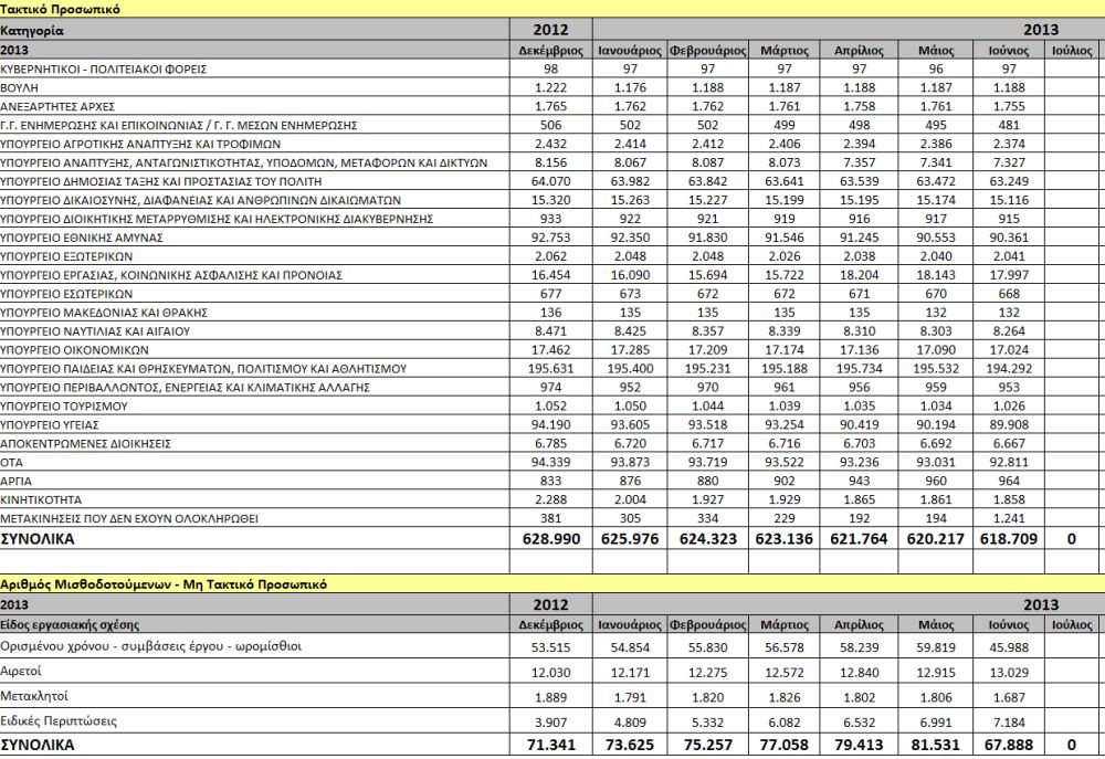 - Κατά 14.937 άτομα έχει μειωθεί ο αριθμός των δημοσίων υπαλλήλων μέσα στο πρώτο εξάμηνο του 2013. Το Δεκέμβριο του 2012 ήταν 628.990 υπάλληλοι και τον Ιούλιο του 2013 έπεσαν στους 614.053. Η μείωση μέσα στον Ιούλιο είναι η μεγαλύτερη αριθμητικά και ποσοστιαία, σε μηνιαία βάση, το 2013.