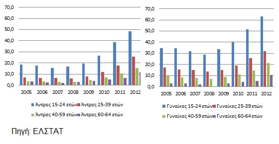 Για να δούμε τελικά ποιοί πληρώνουν την κρίση. Σύμφωνα με τα στοιχεία που έδωσε η ΕΛΣΤΑΤ στην δημοσιότητα βλέπουμε τα ποσοστά της ανεργίας απο το 2005 έως και το 2012 σε γυναίκες και άντρε όλων των ηλικιών.