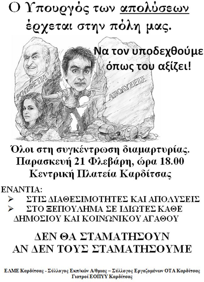 Οι καθηγητές, οι δάσκαλοι, οι εργαζόμενοι στην τοπική αυτοδιοίκηση και οι γιατροί της Καρδίτσας καλούν σε μαζική συγκέντρωση την Παρασκευή 21 Φεβρουαρίου. Εκείνη την ημέρα ο υπουργός Κυριάκος Μητσοτάκης θα επισκεφθεί τη νομαρχιακή οργάνωση Καρδίτσας της ΝΔ.