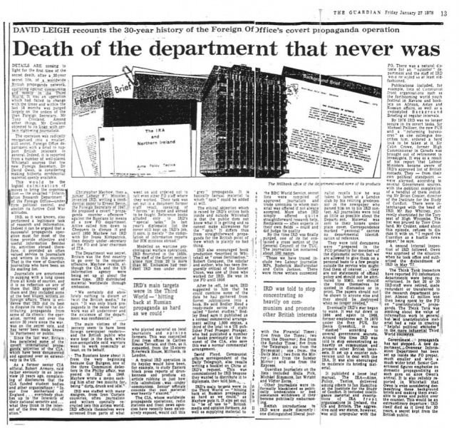 Η προπαγάνδα κατά της Σοβιετικής Ένωσης ξεκίνησε από την αρχή της ίδρυσής της. Η διάχυση κατασκευασμένων ειδήσεων που θα έπλητταν το κύρος και το ήθος της αντίπαλης κομμουνιστικής ιδεολογίας έγινε με μαεστρία αλλά και θράσος. Οι μυστικές υπηρεσίες κυρίως των ΗΠΑ αλλά και της Μ. Βρετανίας χρησιμοποίησαν δημοσιογράφους σε εφημερίδες, περιοδικά, ραδιόφωνα και τηλεόραση προμηθεύοντάς τους με «αποκλειστικές» πληροφορίες. Τα μέσα μαζικής ενημέρωσης μαζί με τον κινηματογράφο παρήγαγαν την εύπεπτη τροφή προς την απροβλημάτιστη και καθοδηγούμενη κοινή γνώμη. Συμπληρωματικά προς αυτές τις μεθόδους χρησιμοποιήθηκαν ακαδημαϊκοί και λογοτέχνες οι οποίοι με την «εγκυρότητα» της υπογραφής τους έδωσαν στις μυστικές υπηρεσίες το άλλοθι της επιστημονικής έρευνας και της μυθιστορηματικής λάμψης.
