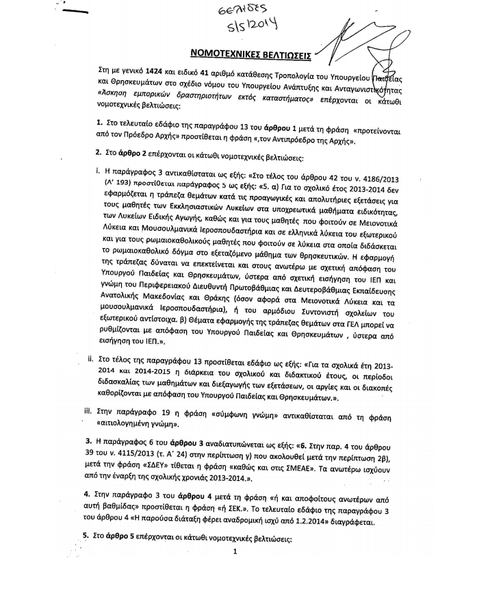 Στη με γενικό 1424 και ειδικό 41 αριθμό κατάθεσης Τροπολογία του Υπουργείου Παιδείας και θρησκευμάτων στο σχέδιο νόμου του Υπουργείου Ανάπτυξης και Ανταγωνιστικότητας «Άσκηση εμπορικών δραστηριοτήτων εκτός καταστήματος» επέρχονται οι κάτωθι νομοτεχνικές βελτιώσεις: