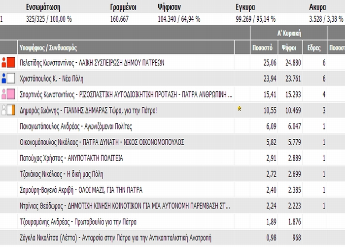 Ο Κωνσταντίνος Πελετίδης με τη Λαική Συσπείρωση (ΚΚΕ), βγήκε πρώτος στην Πάτρα με ποσοστό 25,06% και δεύτερος ο Κώστας Χριστόπουλος με 23,94%. Δείτε παρακάτω αναλυτικά τα τελικά αποτελέσματα.