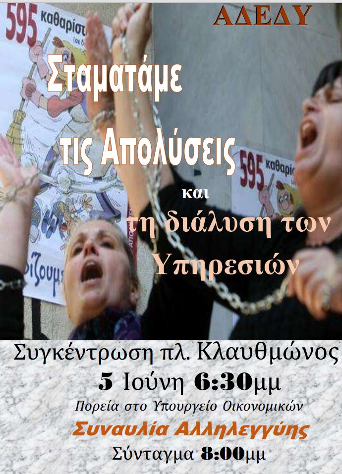 κάθε Ομοσπονδία του Δημοσίου και Ιδιωτικού Τομέα, κάθε Πρωτοβάθμιο Σωματείο, κάθε εργαζόμενο και εργαζόμενη, κάθε άνεργο και άνεργη, κάθε νέο και νέα, συνταξιούχο, να πάρουν μέρος σε συλλαλητήριο ενάντια στις διαθεσιμότητες - απολύσεις και στην αξιολόγηση που θα πραγματοποιηθεί στην Πλατεία Κλαυθμώνος την Πέμπτη, 5 Ιουνίου 2014 και ώρα 6.30μμ, καθώς και στην πορεία που θα ακολουθήσει και θα καταλήξει στο Υπουργείο Οικονομικών (Καραγ. Σερβίας 10), όπου οι καθαρίστριες επί 27 μέρες πραγματοποιούν καθιστική διαμαρτυρία, απαιτώντας την εκτέλεση της απόφασης του Μονομελούς Πρωτοδικείου Αθηνών, που διατάσσει την άμεση επαναπρόσληψή τους.