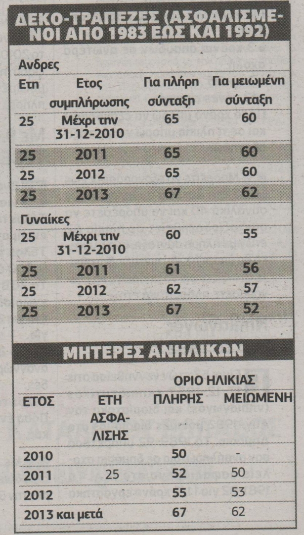 ΜΕ 2 ετία, αλλά και με ταυτόχρονη ύπαρξη ορίου ηλικίας, «κλειδώνει» το συνταξιοδοτικό δικαίωμα στα λεγόμενα ειδικά ταμεία, δηλαδή στους φορείς ΔΕΚΟ και τραπεζών. Ειδικό καθεστώς υπάρχει για τις μητέρες που θεμελιώνουν δικαίωμα με 25 ετία και την ταυτόχρονη ύπαρξης ανήλικου τέκνου.