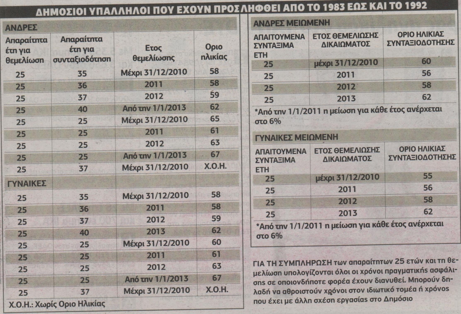 Σε περίπτωση που το δικαίωμα κλειδώσει το 2011, πλήρης σύνταξη καταβάλλεται στα 52 και μειωμένη στα 50. Το 2012 πλήρη σύνταξη δίνεται στα 55 και μειωμένη στα 53.