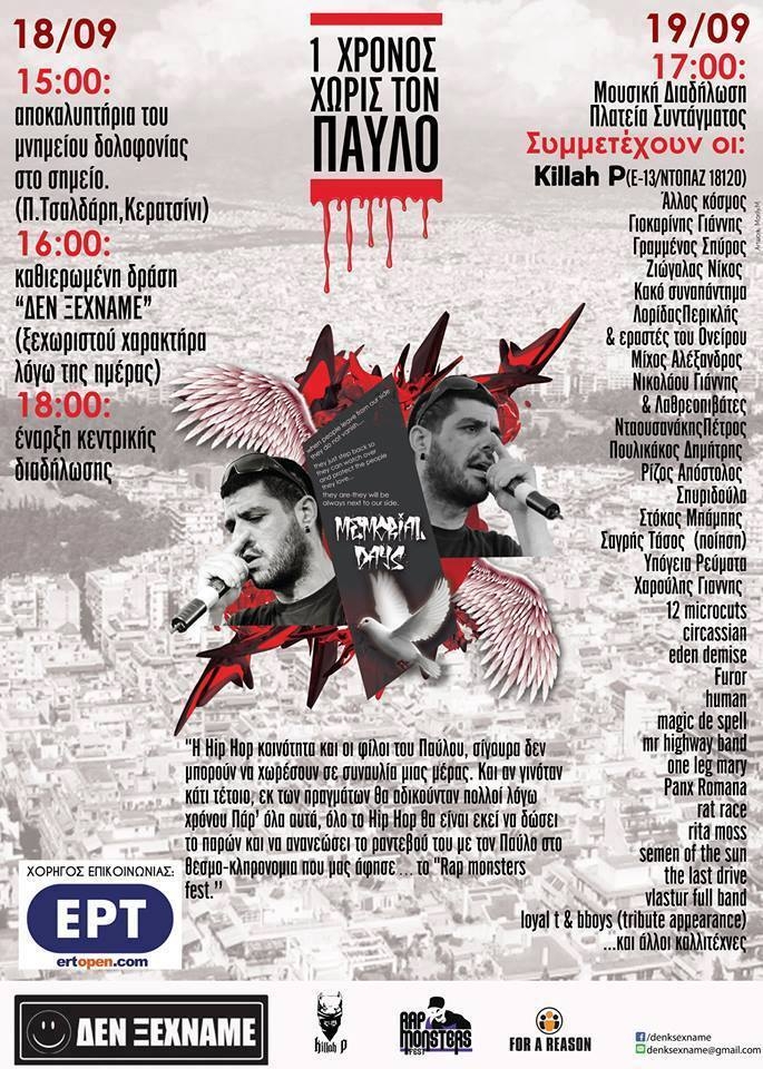 Στις 18 και 19 Σεπτέμβρη θα υπάρξει διήμερο εκδηλώσεων μνήμης στο Κερατσίνι και στην πλατεία Συντάγματος καθώς θα έχει περάσει ένας χρόνος από την δολοφονία του Παύλου Φύσσα από την Χρυσή Αυγή.