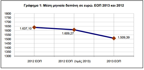 Συγκεκριμένα η μέση μηνιαία δαπάνη των νοικοκυριών εμφάνισε το 2013 μείωση της τάξης του 7,8% ή 127,71 ευρώ και διαμορφώθηκε στα 1.509,39 ευρώ.