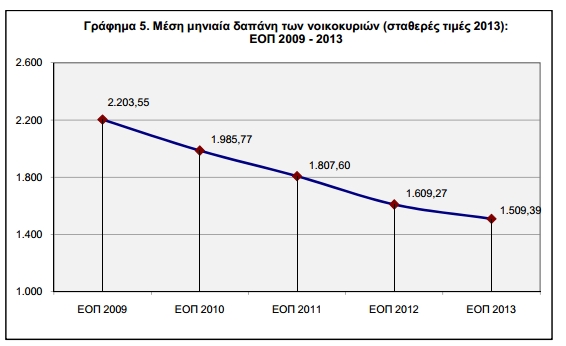 Σύμφωνα με την έρευνα, συγκρίνοντας τα αποτελέσµατα της έρευνας του 2013 µε αυτά των προηγούμενων ερευνών, σε σταθερές τιµές , παρατηρούµε µείωση της µέσης µηνιαίας δαπάνης των νοικοκυριών από 2.203,55 ευρώ το 2009 σε 1.509,39 ευρώ το 2013, η οποία αντιστοιχεί σε µείωση κατά 31,5%. Η αντίστοιχη µείωση σε τρέχουσες τιµές ανέρχεται σε 26,9%